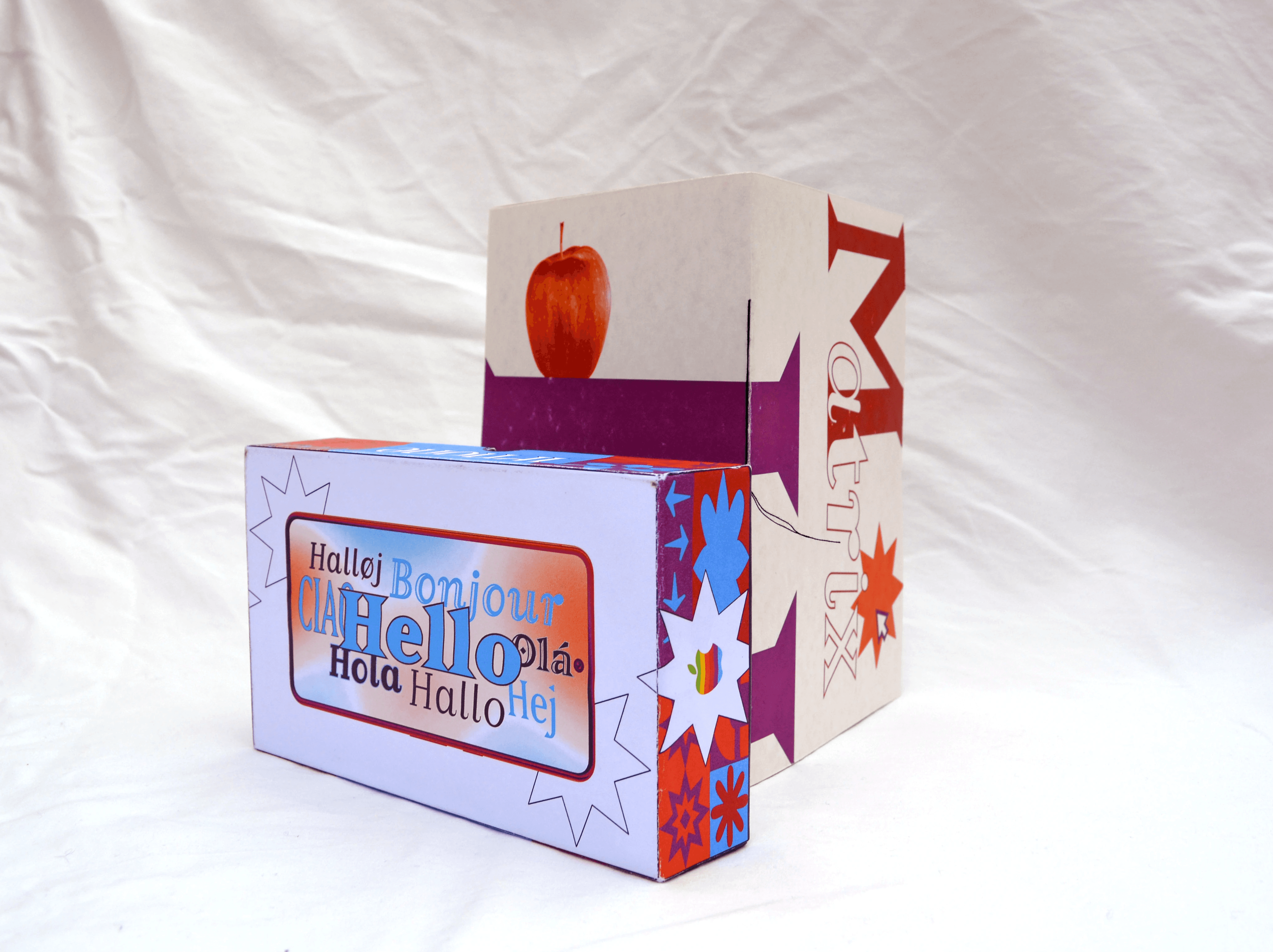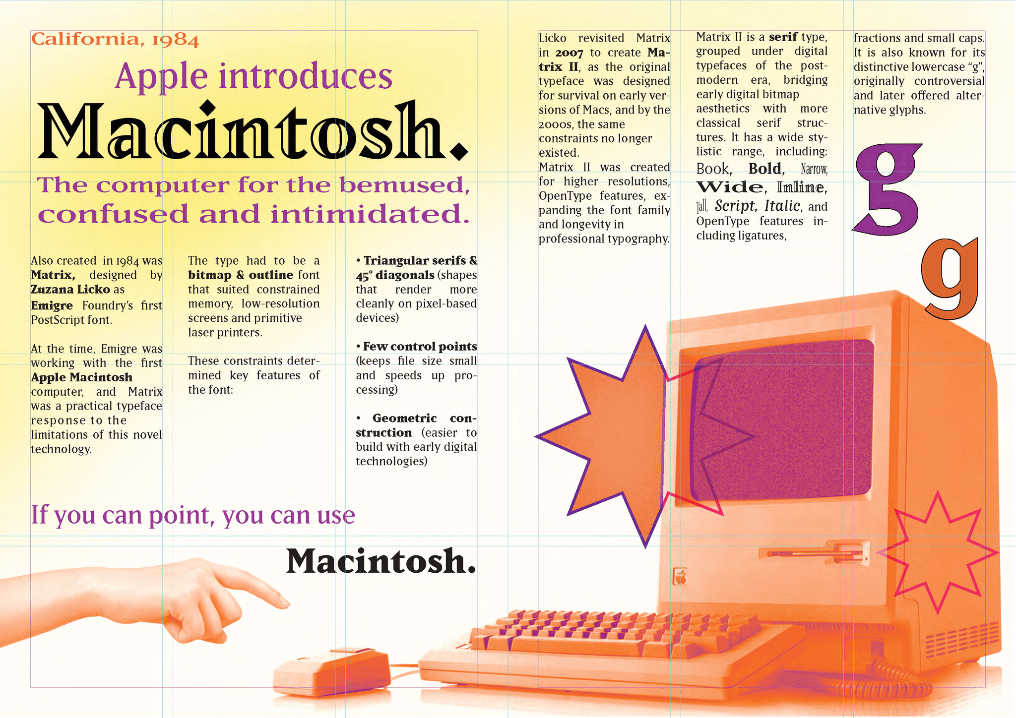 This type specimen explores the evolution of Emigre’s Matrix (1984), compatible with the early Macintosh, into Matrix II (2007), designed for longevity. The project showcases both its historical applications and potential within contemporary Apple product design. By using a retro colour palette drawn from Apple’s 1980’s brand identity, alongside parchment textures and hand-binding, I have given the work an archival quality.